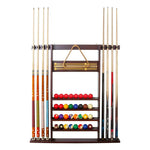 A wall mountable cue rack with 8 cue holders, scoreboard and triangle hook, makes your den neat and classy.
