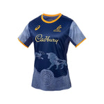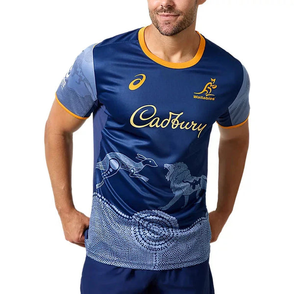 The WALLABIES TRAINING TEE SHORT SLEEVED presents a striking combination of rich base tones and sublimated Indigenous graphic print finished with Wallabies gold trim highlights creating a vibrant finished product.