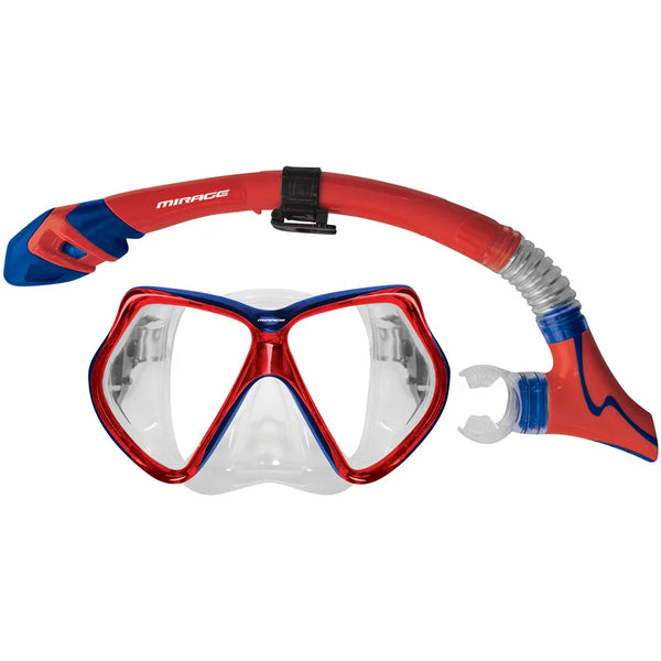 The Mirage Bermuda Adult Mask & Snorkel Set features a unique dry snorkel top to prevent water from entering, making diving easier. The mask is equipped with twin extra-large lenses for exceptionally clear visibility. Additionally, the snorkel has a bore for effortless water expulsion.
