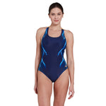 Dive into training with Zoggs Medusa Powerback swimsuit! This suit features a dynamic blue ripple placement print with a contrasting orange back.