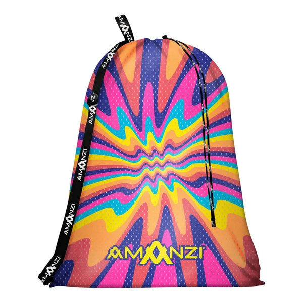 The AMANZI Sundance Mesh Bag features a vibrant print that simply radiates energetic vibes. Bursting with the essence of bright sunshine, this print showcases wavy sunrays that seem to dance in a jubilant display, with the colours exuding the warmth and vivacity of the sun's rays in the sky. Each stroke embodies a joyful rhythm, evoking a sense of vitality and a mesmerizing connection to the celestial dance of light.