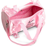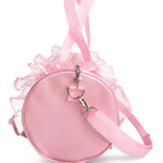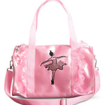 Arrive to class in style with the Sequin Ballerina Barrel Bag. Mesh tulle around the edges creates the beautiful profile of a tutu. Tote straps along with an adjustable shoulder strap for carrying ease. Featuring a large inner zipper pocket to store extra accessories securely. Metal ballerina zipper and sequin ballerina applique for extra unique added details.