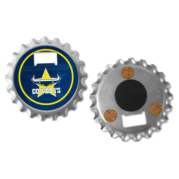 - 3 in 1 gadget - Tough steel bottle opener; Fridge magnet; Cork protection on back for use as a coaster - Size: 9.5cm diameter - NRL Official Merchandise