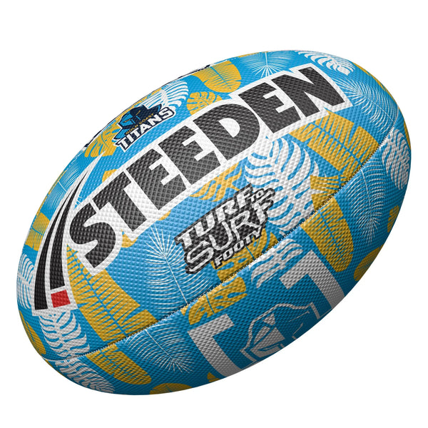Get ready to make a splash with the Gold Coast Titans Steeden NRL Turf To Surf Ball! This water resistant ball is fully foam lined for top-notch shape retention and a oh-so-soft feel. You'll love the diamond grip and size 3 design, making it perfect for backyard games, park hangouts, and beach days.