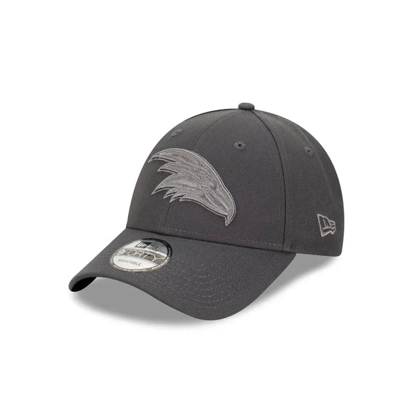 The Adelaide Crows Graphite Grey 9FORTY Cloth Strap features a raised embroidered logo on the Front of a Dark Grey Crown. Additional features include a New Era Flag Logo on the left side.