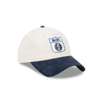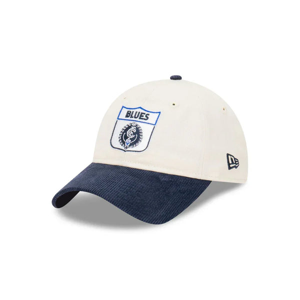 The Carlton Blues AFL Retro 9TWENTY cloth strap features a flat team embroidery detailing on front of a chrome white crown & blue corduroy contrast visor and button. Additional features include a New Era Flag Logo Embroidery on the left side.