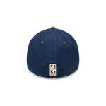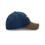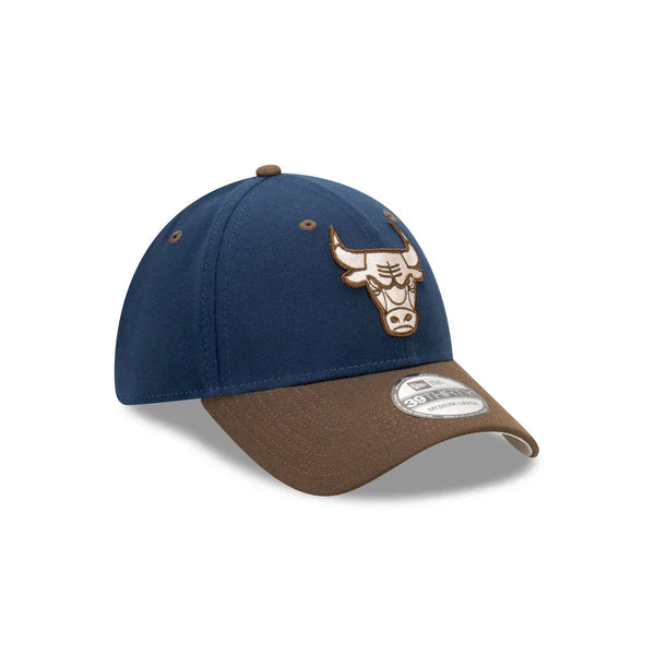 The Chicago Bulls Rustic Navy 39THIRTY Fitted Cap features an embroidered raised Bulls logo detailing in walnut/stone on an Oceanside Blue crown with walnut visor, and flat league embroidery detailing at the back.
