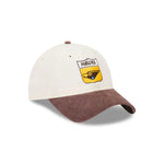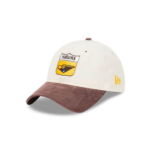 The Hawthorn Hawks AFL Retro 9TWENTY Cloth Strap features a flat team embroidery detailing on front of a chrome white crown & brown corduroy contrast visor and button. Additional features include a New Era Flag logo embroidery on the left side.