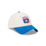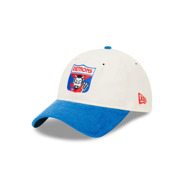 The Melbourne Demons AFL Retro 9TWENTY Cloth Strap features a flat team embroidery detailing on front of a chrome white crown & blue corduroy contrast visor and button. Additional features include a New Era Flag logo embroidery on the left side.