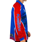 • Novelty fish measuring scale down left sleeve, and team name down right sleeve.