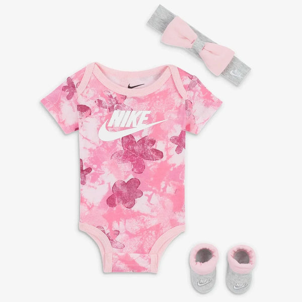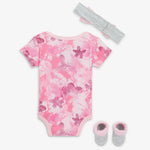 This attention grabbing 3-piece essentials set is almost as cute as your little athlete-to-be. The short sleeve bodysuit has lapped shoulders and snap closures at the crotch for easy changing and dressing, the headband has hook-and-loop closures for comfy wear and the matching booties feature logo embroidery.