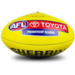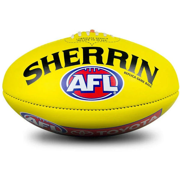 The AFL Replica Game Ball is ideal for those looking to have a footy game with mates down at the local oval or in the backyard. Yellow in colour, it is ideal for a twilight game or training. Made with Premium Leather, it is of match quality and suited to grass surfaces only.