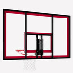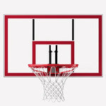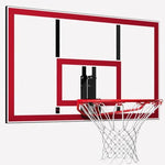 Ball every day. This backboard is made of polycarbonate material that's clear as glass but near-impossible to destroy. It comes with a steel rim that breaks to the front.