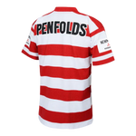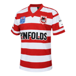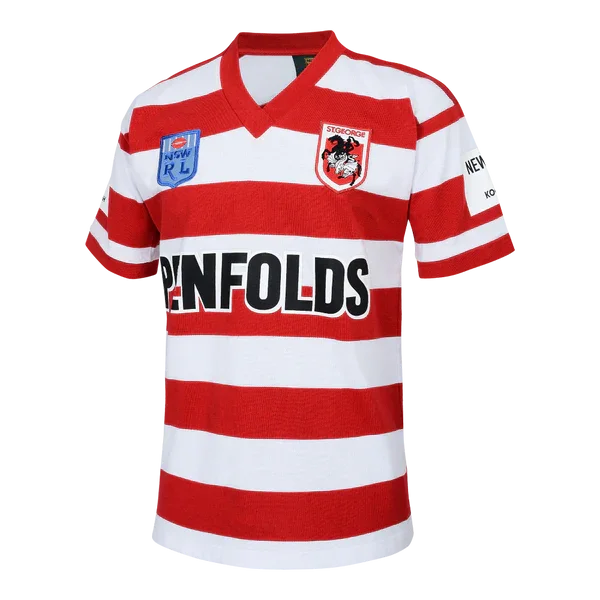 The 1992 St. George Dragons jersey is a tribute to one of rugby league’s most storied clubs. In 1992, the St. George Dragons primarily wore their traditional white jersey featuring the iconic red "V" design. However, they also had an alternative jersey with red and white horizontal stripes, which was occasionally used during that season. The striped design was a nod to the club's earlier uniforms, reflecting a rich history and tradition. While the red "V" jersey remains the most iconic, the striped version symbolises a unique period in the club's storied past.