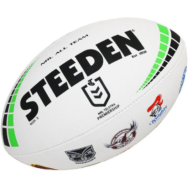 This Steeden NRL all team logo rugby ball is perfect for any young NRL fan! This NRL all team rugby ball is a 2 ply construction, with the panels been cut using advanced symmetrical laser cutting technology. This ball is hand stitched and has a super latex bladder for better air retension. This NRL all team logo rugby ball is a great way to celebrate this special holiday, and serves as a fantastic gift to your favorite rugger!