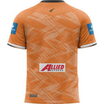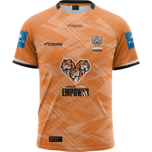 Wests Tigers 2025 Kids Training Tee • Sublimated training tee featuring moisture wicking fabrics with tonal print design. • Shoulder yoke panelling, angled side seams and front and back curved hem detail.