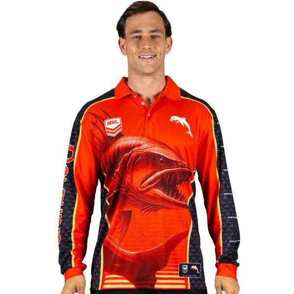 Official NRL Fishing Shirts in a jersey-based design, with strong fishing elements. A menacing looking Barracuda is featured prominently across the front, providing high visual impact and “hang appeal”. A perfect gift for everyone who loves their “Footy & Fishing”