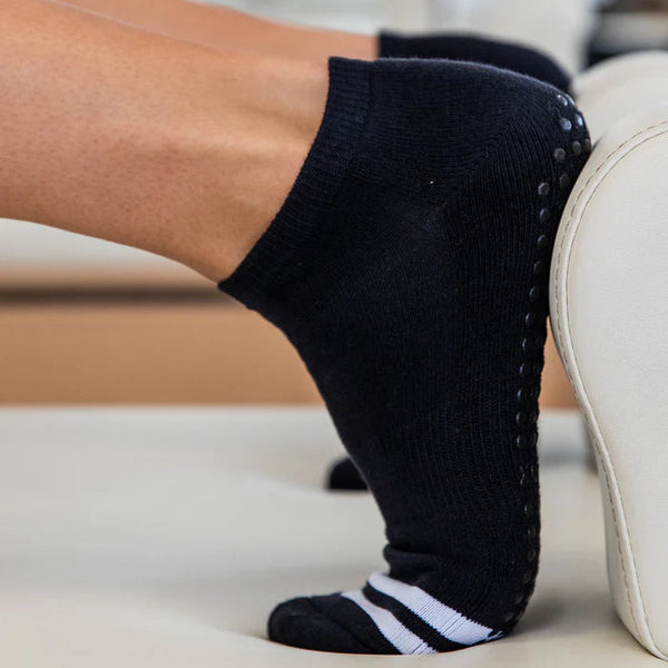 Our grip socks will make the perfect addition to your workout! With a new improved style featuring arch ribbing for extra stability and a thicker sole for enhanced comfort and durability. Not only do they look fabulous, but their grippy soles keep you stable on your mat or reformer, so you can master every pose with confidence.