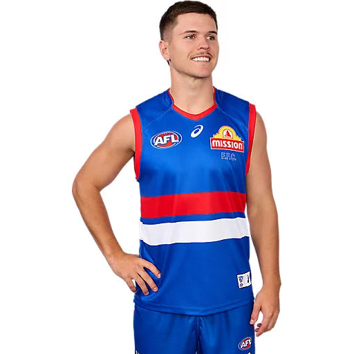 The 2026 Replica Home guernsey features the clubs iconic red & white hoop design on the Bulldogs royal base higlighted with red sleeve trims.