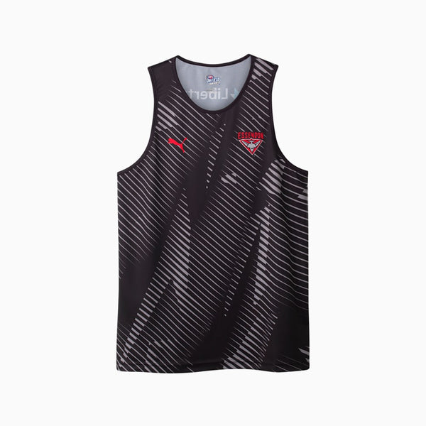 Train with purpose in the 2026 Essendon FC Training Singlet. The graphic draws inspiration from the power and motion of a bomber in flight, with bold red velocity lines cutting across the black base to create a sense of speed, energy, and direction.