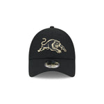 The Penrith Panthers NRL Supporter Black Gold 9FORTY Snapback features an embroidered raised gold Panthers logo on a structured and contoured polyester black crown, a gold NE Flag logo on the left, and an adjustable snapback enclosure.