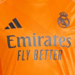 Highlighting the rise of a brand-new football generation. Created to complement Real Madrid's shimmering skills, this adidas away jersey stands out with a vibrant orange base and an abstract, star-inspired design. Its dark blue details include an embroidered club badge. Behind the scenes, moisture-managing AEROREADY will keep fans on top of their game.
