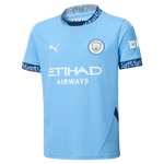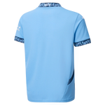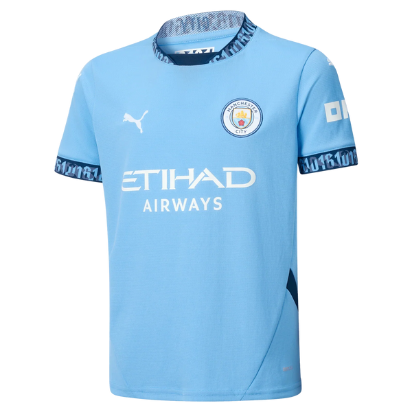 This official Manchester City 2024/25 Home jersey for kids is drawing inspiration from Manchester’s 0161 area code because for us it's a sense of what being Mancunian is all about. You’ll see it written on lampposts, printed on t-shirts, and tattooed on people. You will find it printed inside the neckline and featured in a patterned flat knit rib on the neckline and cuffs. The accents are the OKX print on the left sleeve, the iconic Manchester City crest and PUMA Cat logo embroidered on the chest. Designed for the fans, the home kit jersey pairs the same match-worn look with a casual short-sleeve silhouette and comfortable regular fit for kids, ideal for both game day and everyday wear. If it’s Sky Blue, it’s 0161. That’s Manchester Calling.