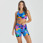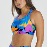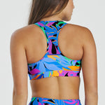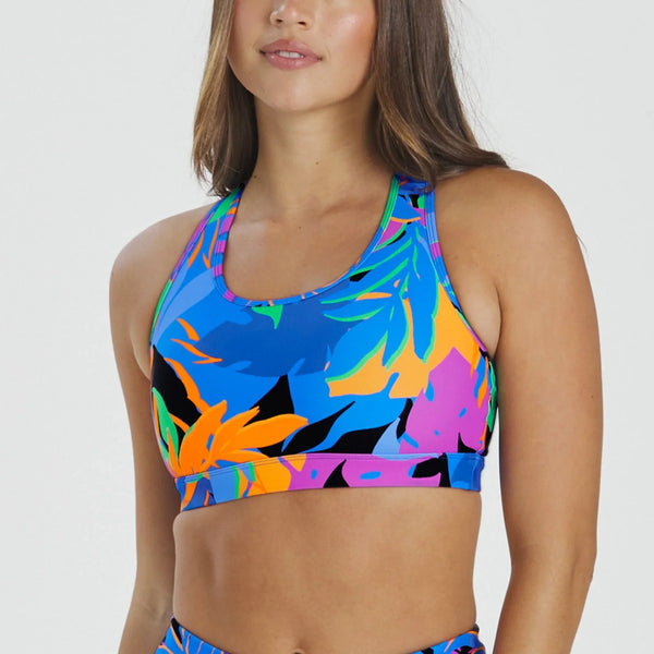 Run, Swim or the gym! Our Chlorine Resistant Run//Swim performance fabric has supportive, no-show 4-way stretch. High coverage racerback with extra built-in support and designer laser cut panels. This crop features removable cups, powermesh racerback and wide, comfy straps.