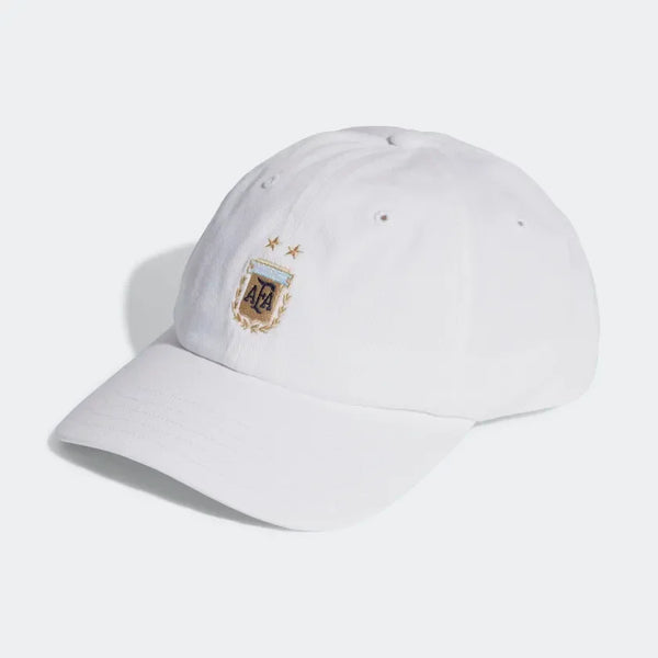 Show your support for Argentina. Perched above the pre-curved brim of this adidas football cap, an embroidered version of the team's famous badge takes pride of place. Done up in their famous home colours, this baseball-style cap includes an adjustable strap at the back to help you find a comfortable fit. Our cotton products support more sustainable cotton farming.