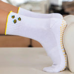 Brighten up your workout with these frilly grip socks, complete with a sunny yellow frill and adorable bee embroidery. With a new improved style now featuring arch ribbing for extra stability and a thicker sole for enhanced comfort and durability. Not only do they look fabulous, but their grippy soles keep you stable on your mat or reformer, so you can master every pose with confidence.