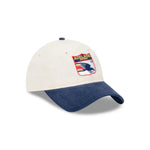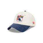 The Adelaide Crows AFL Retro 9TWENTY Cloth Strap Features a Flat Team Embroidery Detailing on Front of a Chrome White crown & Blue Corduroy Contrast Visor / Button. Additional Features include a New Era Flag Logo Embroidery on the Left Side