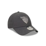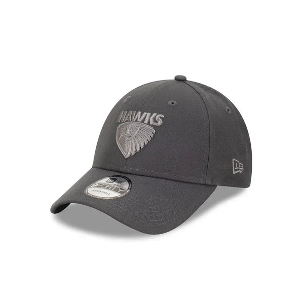The Hawthorn Hawks Graphite Grey 9FORTY Cloth Strap features a raised embroidered logo on the Front of a Dark Grey Crown. Additional features include a New Era Flag Logo on the left side.