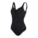 Enhances, flatters and feels good all over. Timeless and elegant, this flattering new AquaNite swimsuit in classic black uses gentle ruching and a soft V-neckline design to flatter your shape and create a beautiful silhouette. Offering medium bust support, the hidden bust shelf liner and adjustable straps ensure a great fit during your workout, while the all-over shaping fabric provides support where you need it. Made from 100% pre-consumer waste fabric, our soft new ECO SHAPE COMPREX ULTRA fabric teams the best in shapewear innovation with the latest swimwear technology. Perfect for your regular workout, it includes LYCRA® XTRA LIFE™, which is ultra-chlorine resistant and lasts twice as long as standard swimwear fabrics.