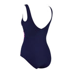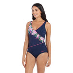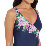 The Orchid Daze Wrap Front Once Piece is one of our most popular & flattering swimwear styles. Featuring a striking tropical floral print & hot pink piping, this flattering wrap front style also has tummy control and full foam cups for extra support. The V shaped scoopback gives great figure support and the low leg ensures full coverage while swimming. Available in sizes 8 - 26, the wrap front one piece is perfect for aqua aerobics and lap swimming. This suit will last the distance - it is 100% chlorine proof and made with recycled plastic bottles in our Ecoalst+™ fabrication.