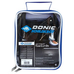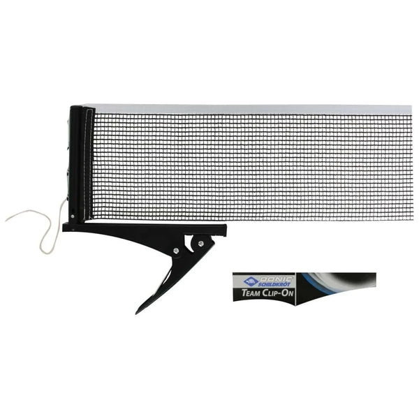 The popular Team Clip On table tennis net set from Schildkröt impresses with its attractive price-performance ratio. The practical clip attachment (similar to a glue clamp) allows for quick assembly and disassembly without screws. Simply open the clip and slide it onto the table. The additional rubber inserts and the fairly tight spring of the clip mechanism ensure a secure and non-slip fit. Robust metal construction, foldable posts for compact transport dimensions. The net is made of nylon, robust and weatherproof, and can be tensioned using a threaded cord. The complete net set comes in a practical carrying bag with a zipper and handle. It can be assembled and disassembled quickly and easily, making it the ideal companion for public table tennis tables without a net. The maximum table thickness is 3.5 cm.