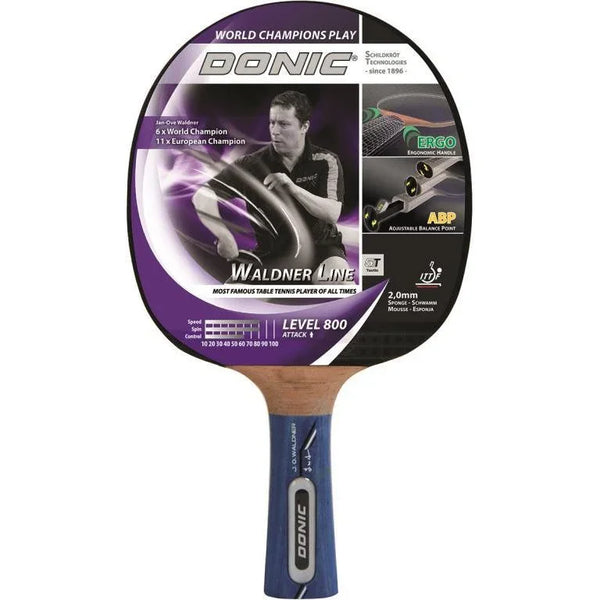 Donic Waldner 800 is a competition quality bat. Waldner 800 is a ITTF approved bat and features, 5T Tactic blade, 2.0mm competition sponge, Vari slick rubbers, Concave handle with ERGO design and ABP adjustable balance point.