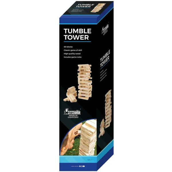 Formula Sports Tumble Tower has 60 large wood blocks; the aim of the game is to stack them up, 3 per row and try to remove a block from each row and then place it on top of the precariously unstable tower, creating another row of 3. This is a game of skill, analytics and exceptionally steady hands.