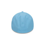 The Las Vegas Raiders Sky Blue 39THIRTY Fitted features an embroidered tonal Raiders logo on a low-profile contoured crown, a tonal NE Flag logo on the left, and a stretch polyester fit enclosure.