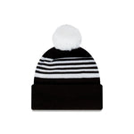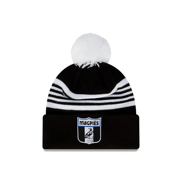 The Collingwood Magpies Heritage Stripe Beanie with Pom features a raised Collingwood Magpies Retro Logo on the cuff in a 2-tone Striped Black, Grey and White Crown. Additional features include a New Era Flag Logo on the left side.