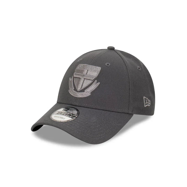 The St. Kilda Saints Graphite Grey 9FORTY Cloth Strap features a raised embroidered logo on the Front of a Dark Grey Crown. Additional features include a New Era Flag Logo on the left side.