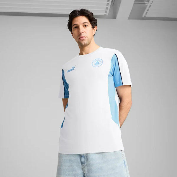 Celebrate the best club of Manchester with this new PUMA tee. Featuring a regular fit and a bold rubber print, it's perfect for cheering at the Etihad Stadium. The iconic PUMA Cat Logo on the chest completes the look, making it a must-have for any true Cityzen.