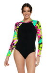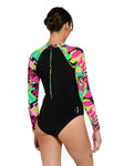 The Zoggs thermal Vivid Paddle Suit is fully front and back thermal lined (excluding sleeves), with a medium leg height. The bright sleeve print ensures you remain visible in the open water. Long printed pull cord at back makes zipping up the suit so much easier!