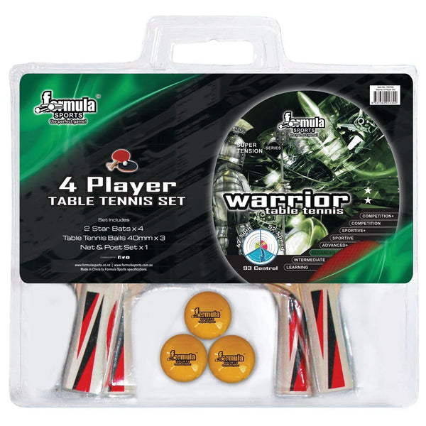Warrior 4 Player Set has everything you need to play Table Tennis...except the table! It's the perfect starter pack if you've just purchased a table and also makes for a fun-packed gift. The set comes with four bats that have a 2 star rating, which makes them perfect for amateurs and players with some experience looking to improve their game. It also comes with a net and post set that fits all standard table tennis tables and three regulation size balls.